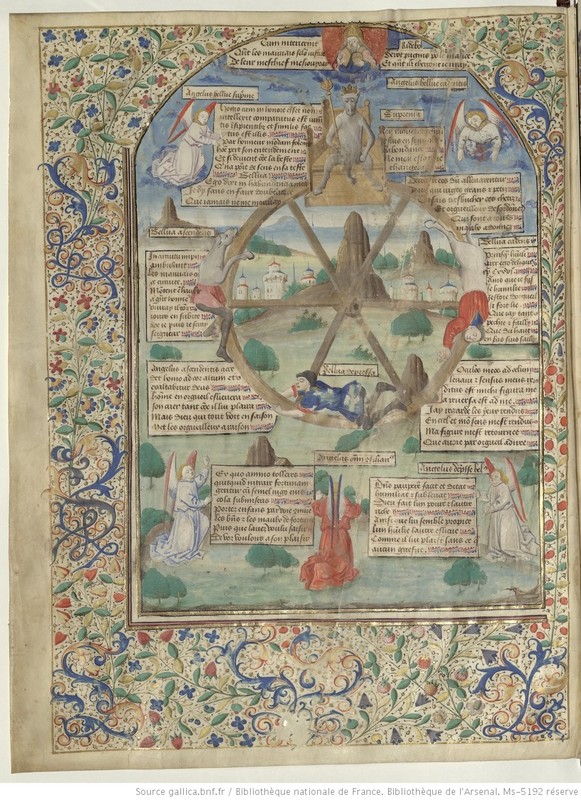 Parigi, Bibliothèque de l'Arsenal, 5192, f. 1v. Un essere antropomorfo con la corona e lo scettro (la Fortuna?) siede in cima alla ruota che controlla i destini degli uomini, cui sono aggrappati tre personaggi metà uomini e metà animali; in alto il busto di Dio Padre si affaccia tra le nubi, mentre alcuni angeli indicano la scena.