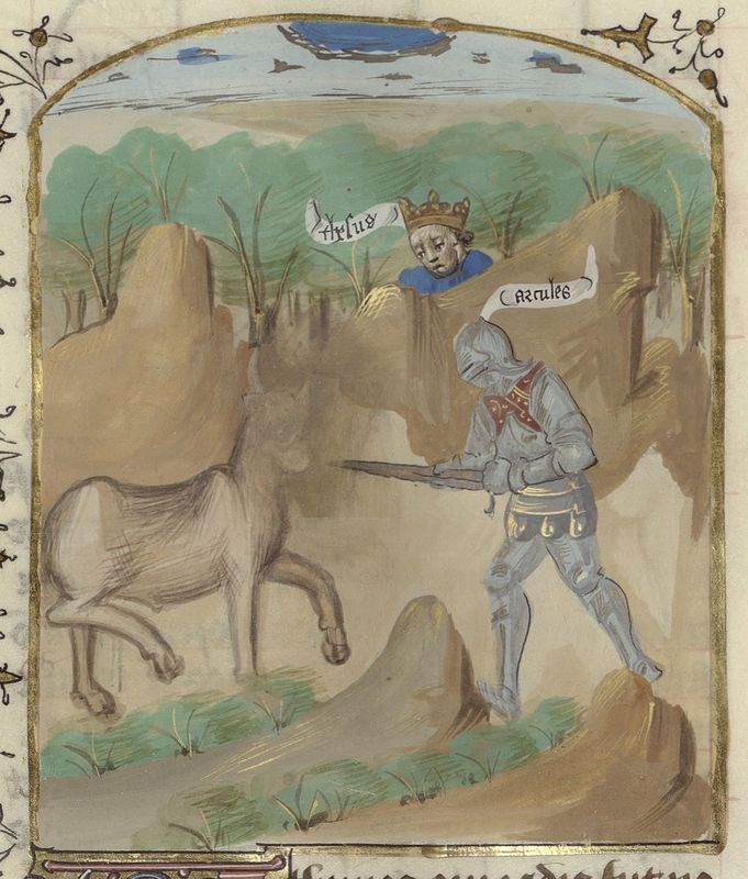 Parigi, Bibliothèque de l'Arsenal, 5192, f. 17v. Teseo sconfigge il Toro di Maratona; Teseo in esilio.