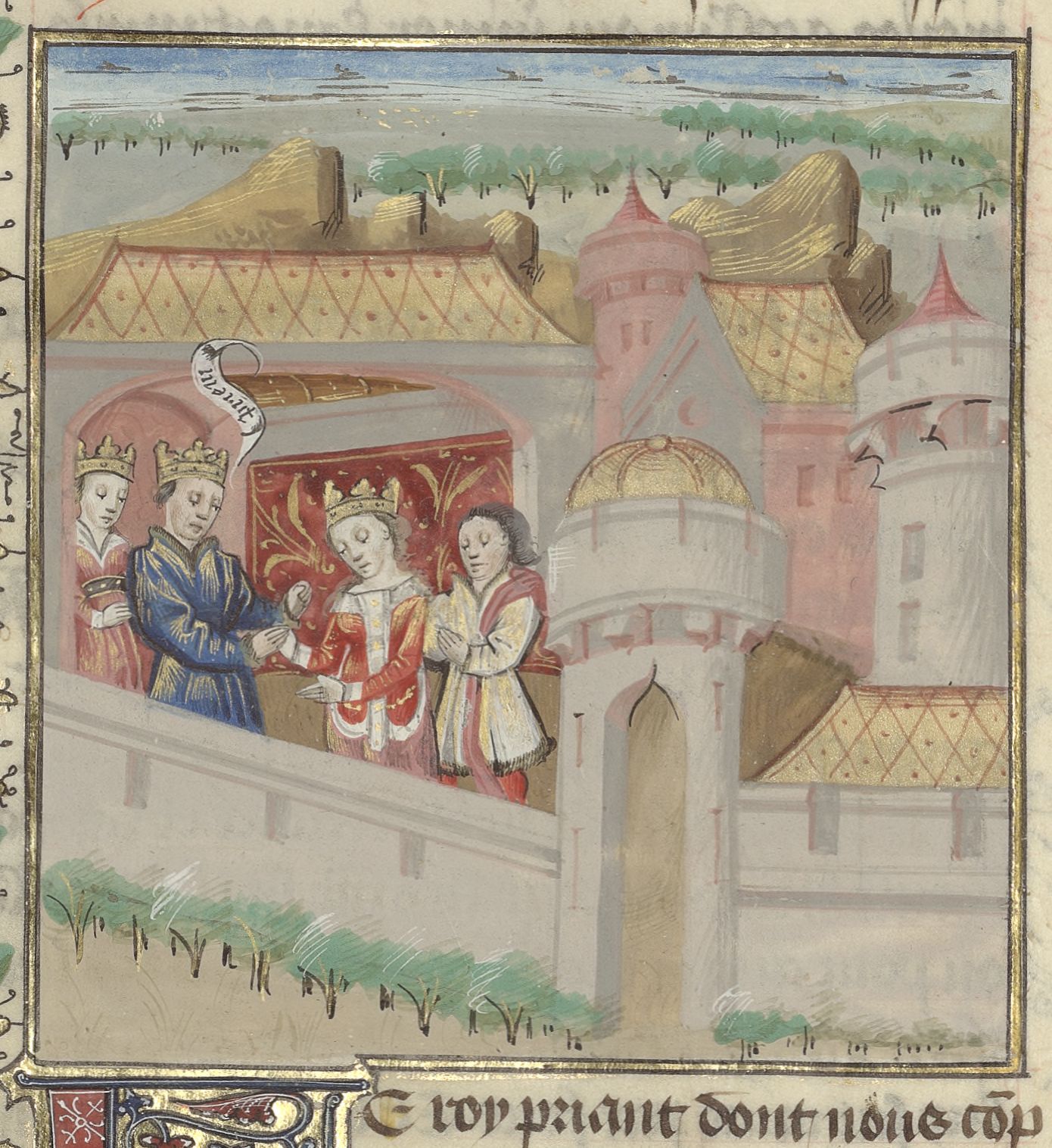 Parigi, Bibliothèque de l'Arsenal, 5192, f. 25v. Priamo ed Ecuba accolgono Paride ed Elena al loro arrivo a Troia.