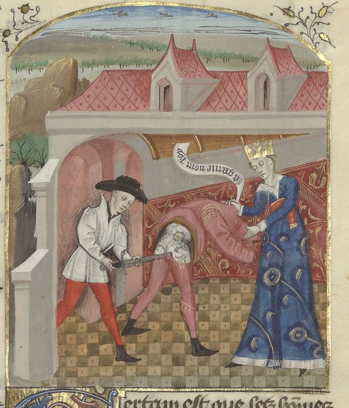 Parigi, Bibliothèque de l'Arsenal, 5192, f. 29r. Egisto uccide Agamennone con l'aiuto di Clitennestra, colpendolo alle spalle mentre si toglie il mantello.