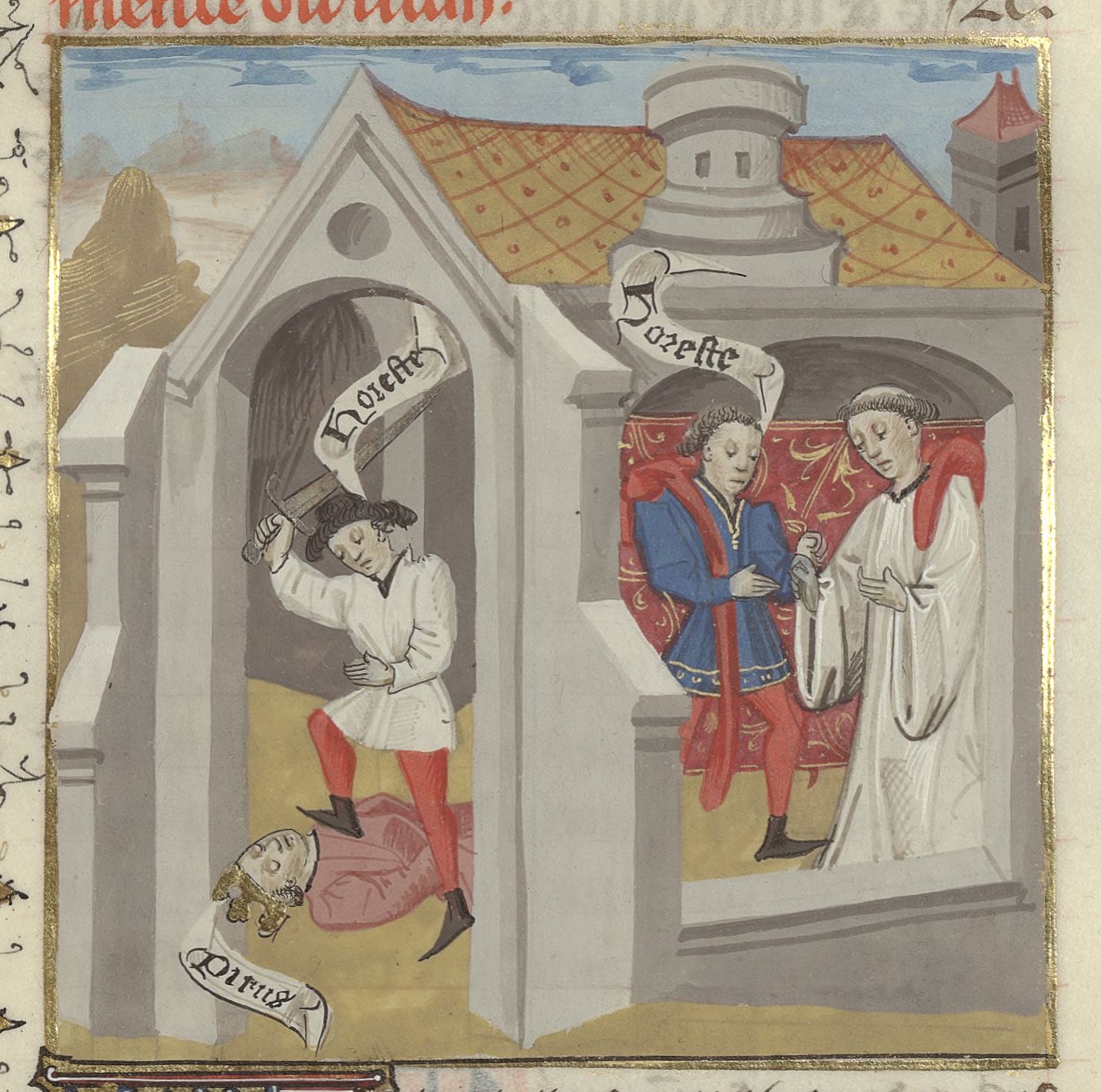 Parigi, Bibliothèque de l'Arsenal, 5192, f. 37r. Il sacerdote Macareo riceve il consiglio di Oreste; Oreste uccide Neottolemo (Pirro), figlio di Achille.