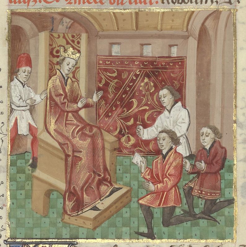 Parigi, Bibliothèque de l'Arsenal, 5192, f. 41v. Roboamo, seduto sul trono, ascolta le suppliche dei suoi sudditi.