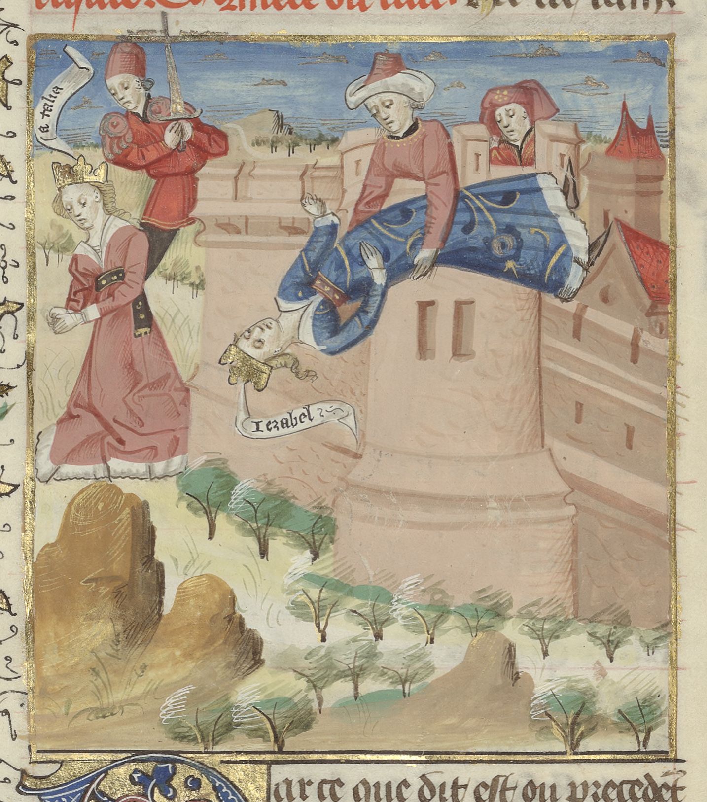 Parigi, Bibliothèque de l'Arsenal, 5192, f. 45v. La regina Gezabele viene gettata da una torre; la regina Atalia viene decapitata.