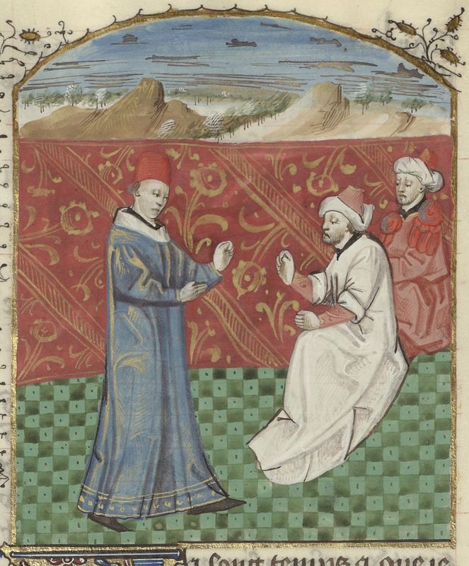Parigi, Bibliothèque de l'Arsenal, 5192, f. 47v. Giovanni Boccaccio incontra due Ebrei.