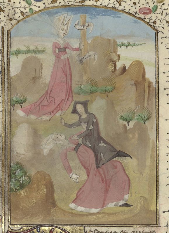 Parigi, Bibliothèque de l'Arsenal, 5192, f. 72v. La Povertà, rappresentata come una vecchia vestita di stracci, lotta con la Fortuna, una dama in abiti eleganti; la Sfortuna, raffigurata anch'essa come una dama, legata ad un palo.