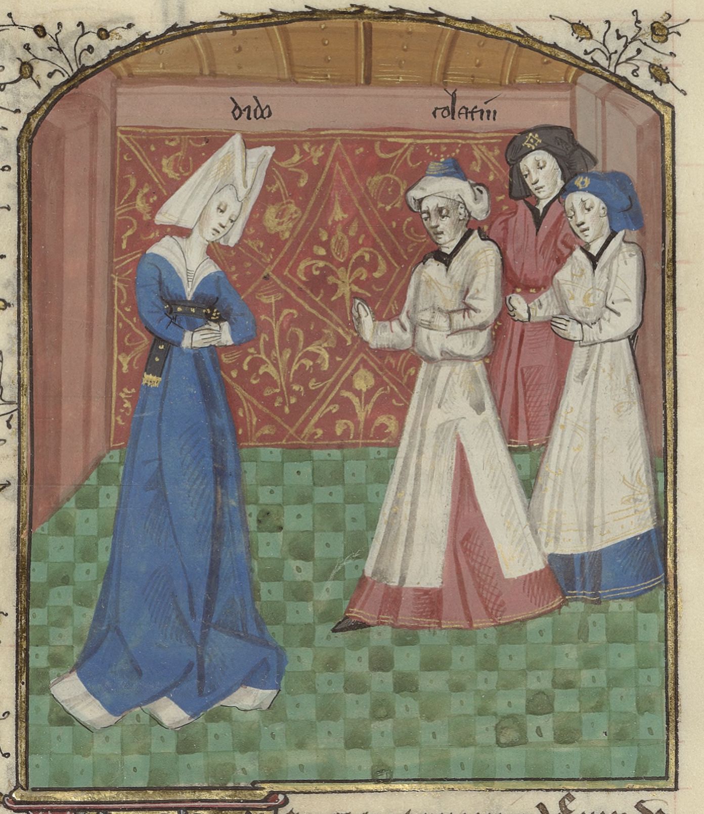 Parigi, Bibliothèque de l'Arsenal, 5192, f. 77v. Lucrezia confessa alla sua famiglia la violenza subita.