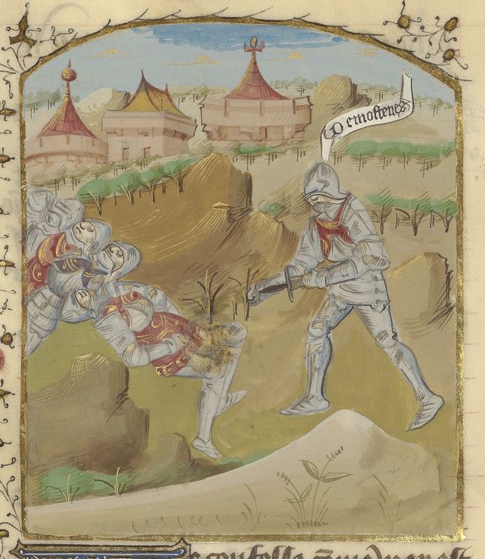 Parigi, Bibliothèque de l'Arsenal, 5192, f. 98v. Demostene compie il suicidio lasciandosi cadere sulla spada accanto ai corpi dei suoi soldati.
