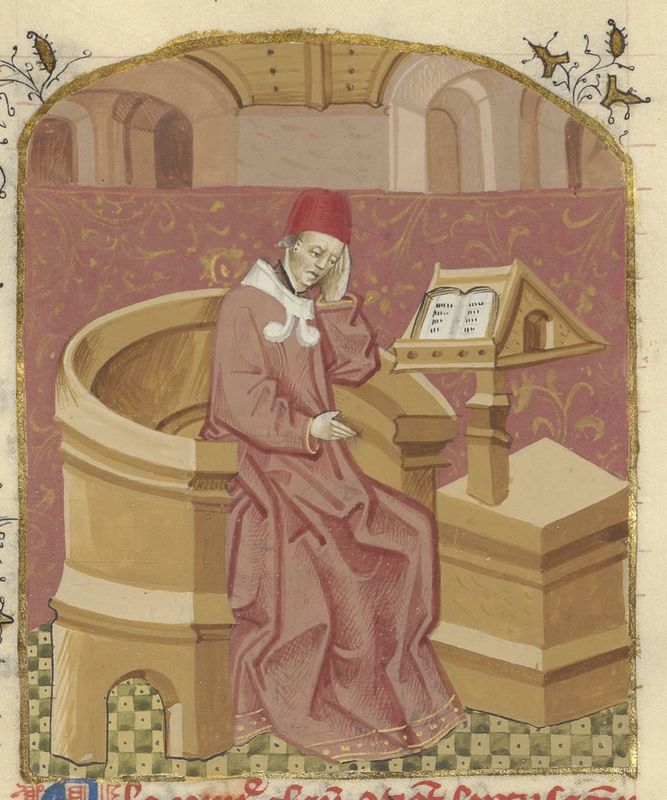 Parigi, Bibliothèque de l'Arsenal, 5192, f. 103v. Giovanni Boccaccio siede assopito dinanzi ad un leggio.