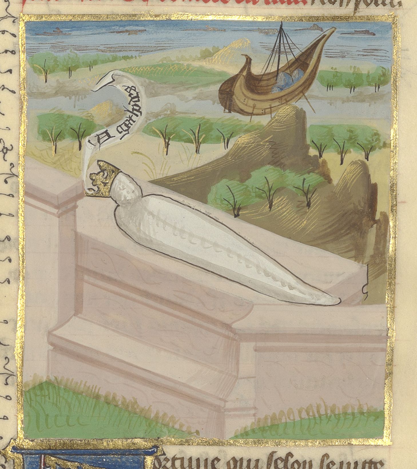 Parigi, Bibliothèque de l'Arsenal, 5192, f. 135r. Il corpo di Agatocle giace avvolto in un sudario su un catafalco; la moglie e i figli di Agatocle fuggono su una nave.