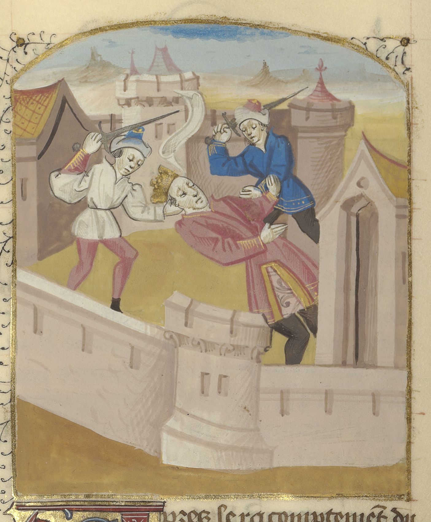 Parigi, Bibliothèque de l'Arsenal, 5192, f. 168v. Geronimo, tiranno di Siracusa, viene assassinato da due sudditi.