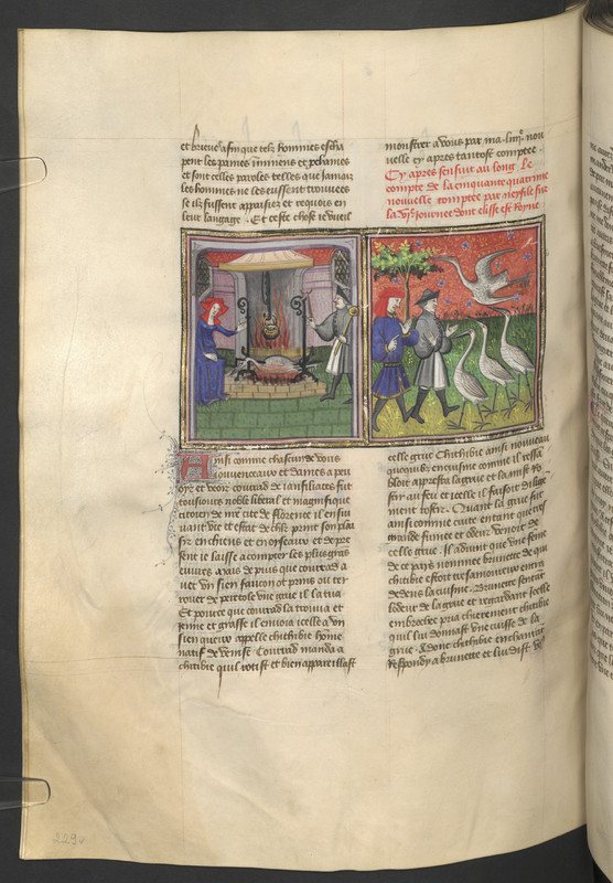 Vienna, Österreichische Nationalbibliothek, 2561, f. 229v. Il cuoco Chichibio offre una coscia della gru a Brunetta; Currado Gianfigliazzi e Chichibio osservano le gru levarsi in volo.