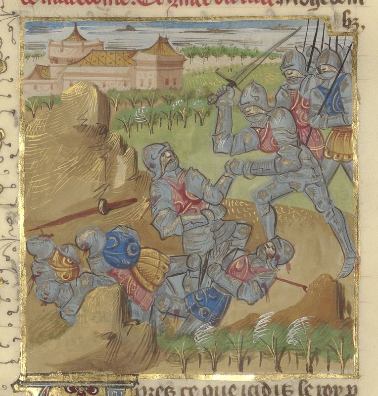 Parigi, Bibliothèque de l'Arsenal, 5192, f. 177v. Andrisco viene sconfitto in battaglia dal console Cecilio Metello.