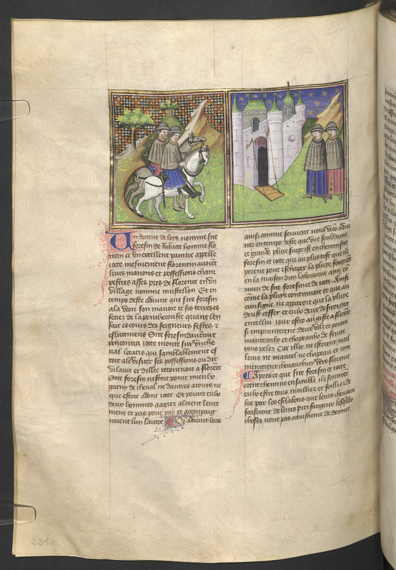 Vienna, Österreichische Nationalbibliothek, 2561, f. 231v. Forese da Rabatta e Giotto percorrono a cavallo la stessa strada; i due uomini giungono alle porte di Firenze.