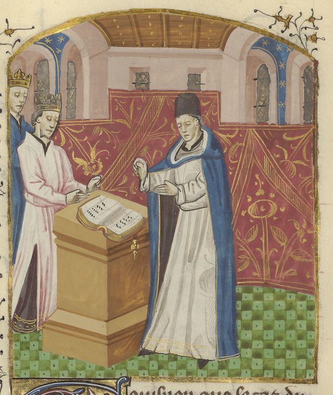 Parigi, Bibliothèque de l'Arsenal, 5192, f. 197v. Giovanni Boccaccio incontra due sovrani colpiti dalla sfortuna.