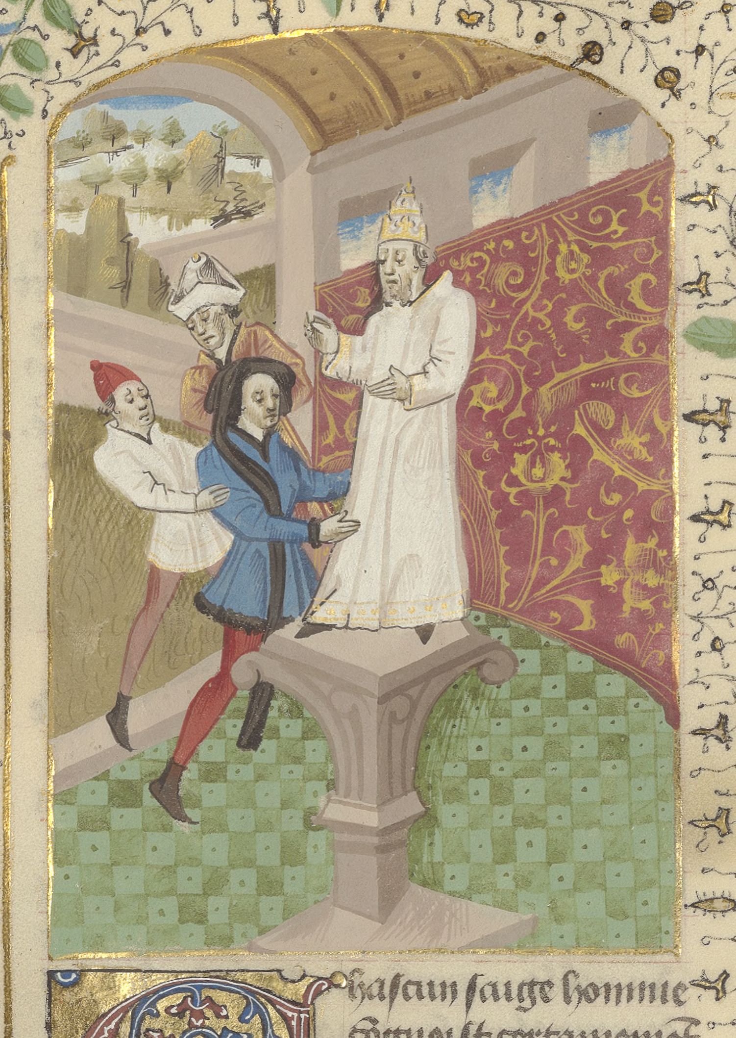 Parigi, Bibliothèque de l'Arsenal, 5192, f. 229r. Marco Antonio Minore viene assassinato mentre tenta di ripararsi dietro una statua di Giulio Cesare.
