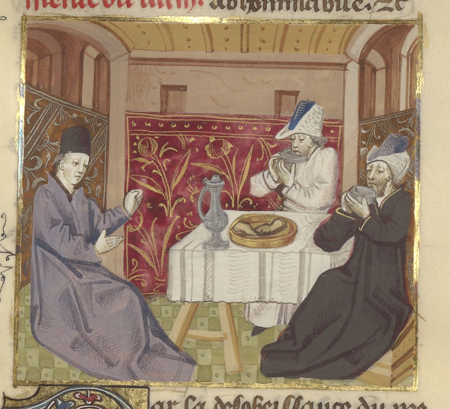 Parigi, Bibliothèque de l'Arsenal, 5192, f. 251r. Giovanni Boccaccio condanna l'ingordigia di due uomini che mangiano seduti ad una tavola.