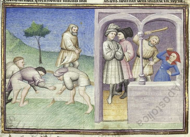 Città del Vaticano, Biblioteca Apostolica Vaticana, Pal. lat. 1989, f. 232v. Il copista del manoscritto, datato 15 giugno 1414, è Laurent de Premierfait. Calandrino, ingannato da Maso del Saggio, insieme a Bruno e Buffalmacco cerca l'elitropia nel torrente Mugnone; vittima della beffa dei suoi amici, Calandrino bastona sua moglie.