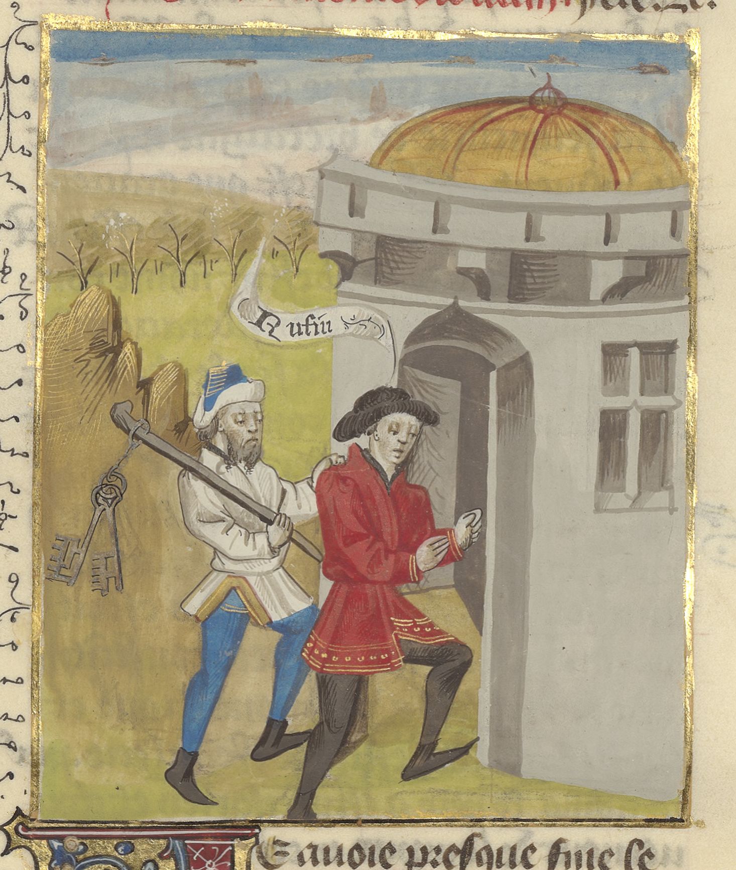 Parigi, Bibliothèque de l'Arsenal, 5192, f. 289r. Rufino viene condotto in prigione.