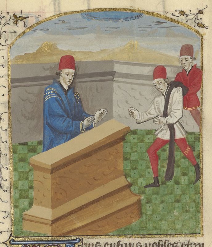Parigi, Bibliothèque de l'Arsenal, 5192, f. 297v. Giovanni Boccaccio incontra due uomini colpiti dalla sfortuna.