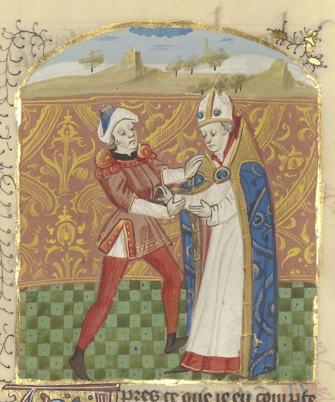 Parigi, Bibliothèque de l'Arsenal, 5192, f. 318r. Adalberone tradisce Carlo d'Angiò.