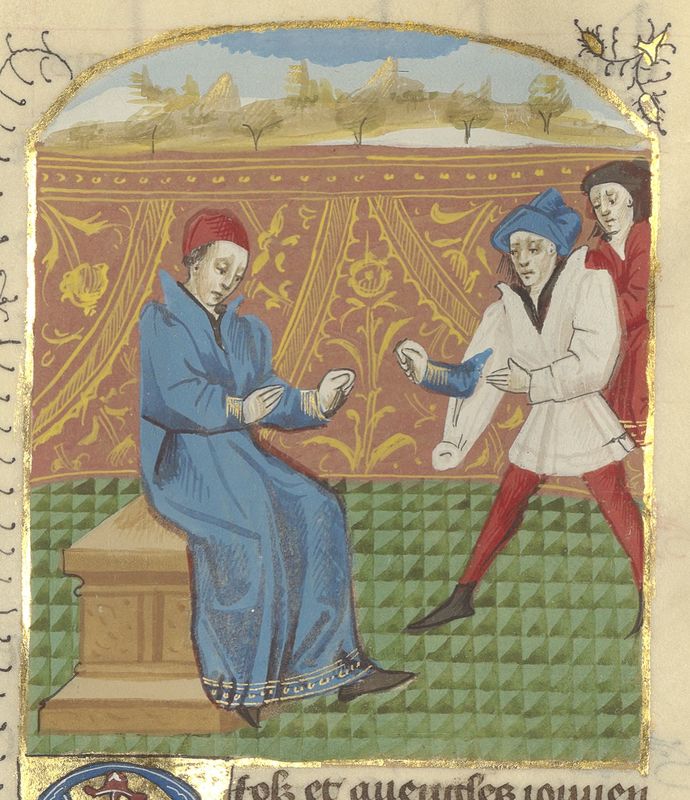 Parigi, Bibliothèque de l'Arsenal, 5192, f. 322r. Giovanni Boccaccio incontra due uomini colpiti dalla sfortuna.