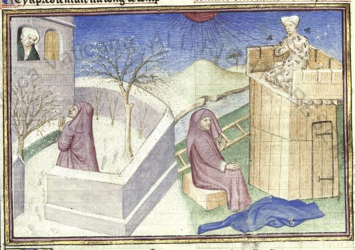 Città del Vaticano, Biblioteca Apostolica Vaticana, Pal. lat. 1989, f. 242v. Il copista del manoscritto, datato 15 giugno 1414, è Laurent de Premierfait. In una notte d'inverno la vedova Elena chiude Rinieri fuori casa; per vendetta Rinieri lascia la donna nuda in cima ad una torre, esposta al sole ed agli insetti.
