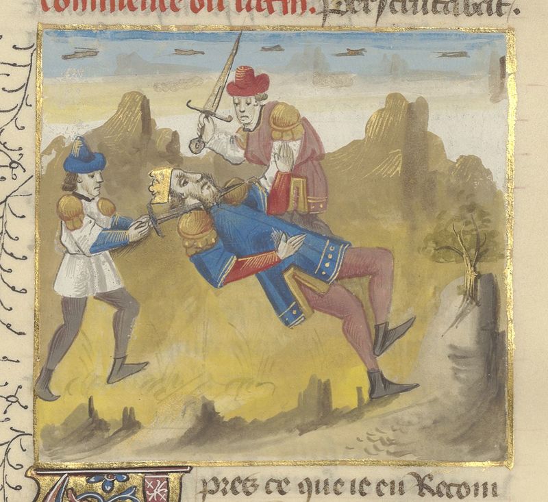 Parigi, Bibliothèque de l'Arsenal, 5192, f. 327r. Un sovrano viene decapitato da due uomini.