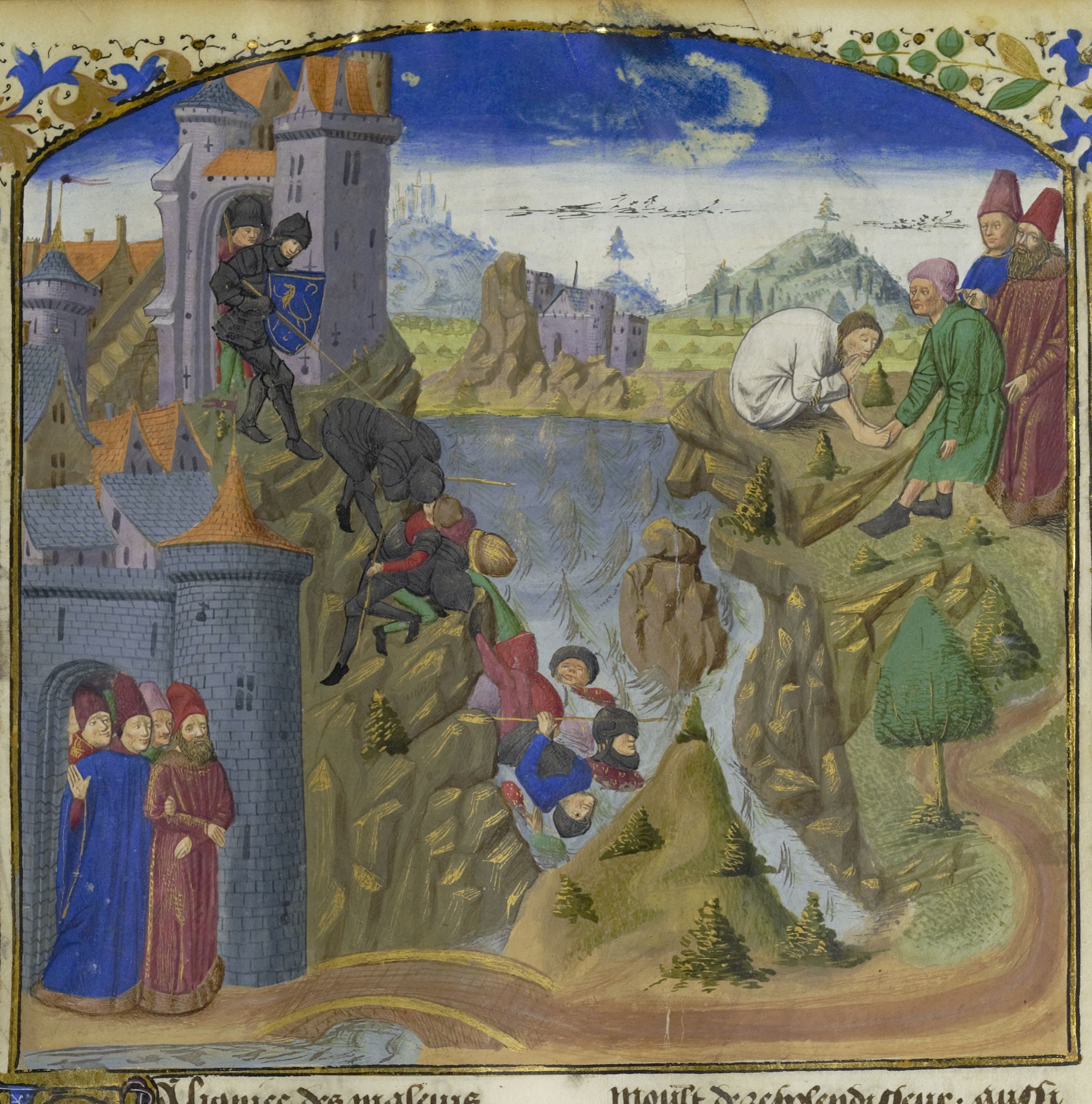 Parigi, Bibliothèque Nationale de France, Fr. 597, f. 58r. Marco Manlio Capitolino respinge l'assedio dei Galli al Campidoglio; Manlio Capitolino viene imprigionato; Manlio Capitolino si appella ai giudici prima di venir gettato dalla rupe Tarpea.