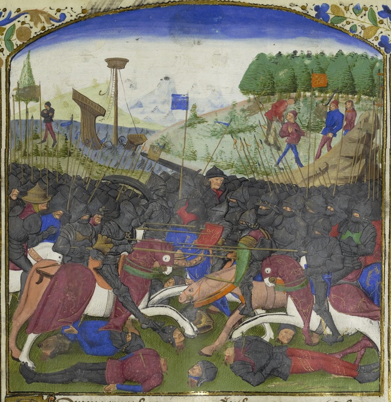 Parigi, Bibliothèque Nationale de France, Fr. 597, f. 78r. Gli eserciti di Seleuco e Antioco si danno battaglia; sullo sfondo, il naufragio della nave di Seleuco; Antioco viene assassinato dai banditi nel bosco.