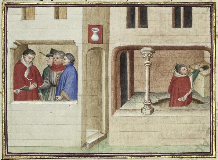Città del Vaticano, Biblioteca Apostolica Vaticana, Pal. lat. 1989, f. 253v. Il copista del manoscritto, datato 15 giugno 1414, è Laurent de Premierfait. Simone da Villa interroga Bruno e Buffalmacco sulle loro compagnie; il maestro cade in una fossa fetida.