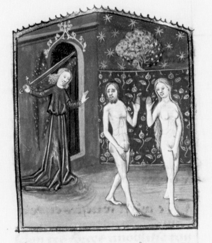 Parigi, Bibliothèque Nationale de France, Fr. 132, f. 3v. Adamo ed Eva vengono cacciati dal Paradiso Terrestre da un angelo con la spada sguainata.