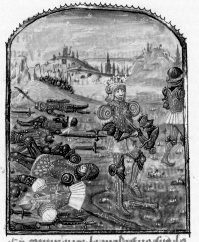 Parigi, Bibliothèque Nationale de France, Fr. 132, f. 23r. Saul compie il suicidio trafiggendosi con la spada accanto ai soldati morti sul campo di battaglia.