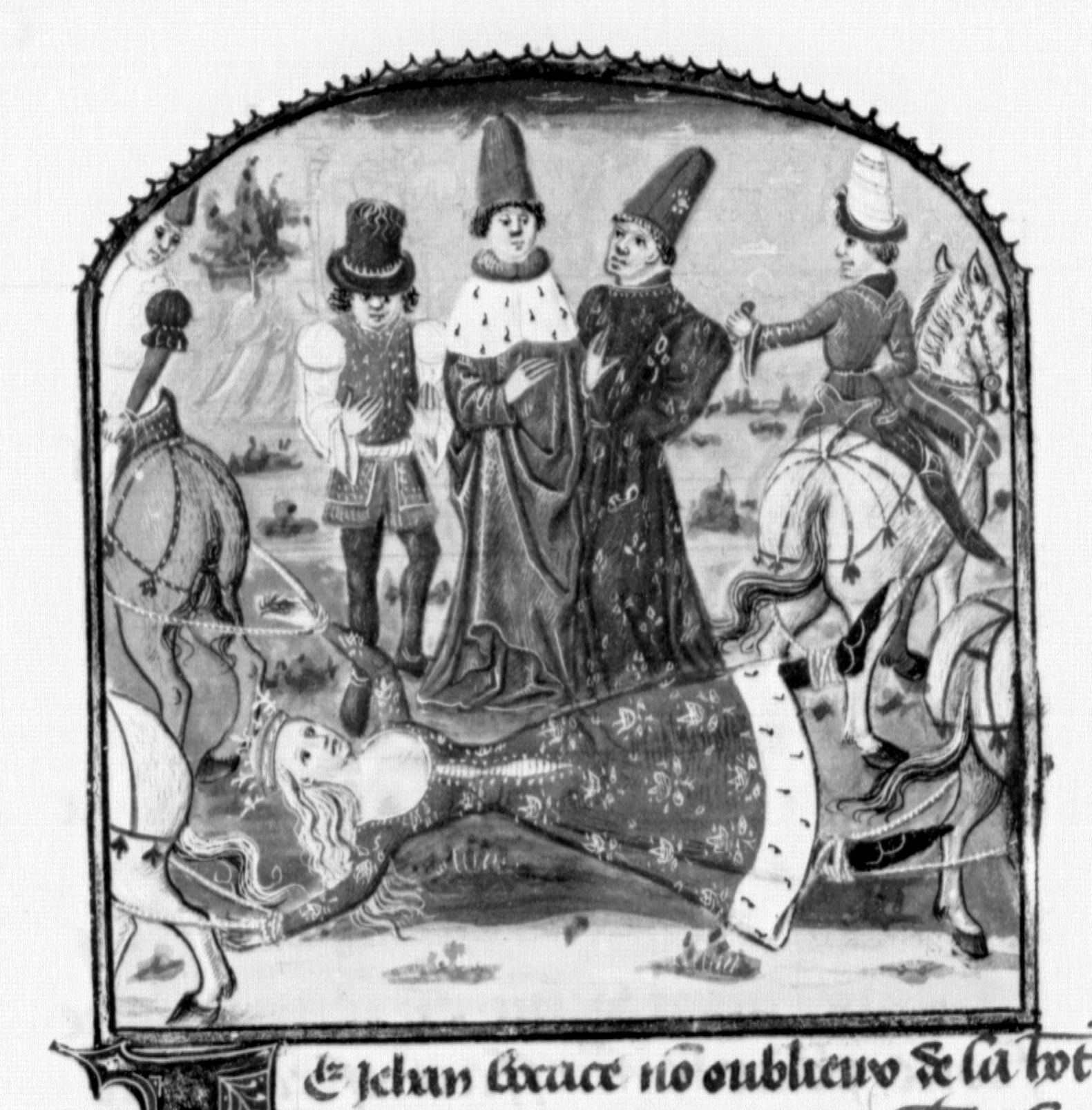 Parigi, Bibliothèque Nationale de France, Fr. 132, f. 159v. Brunichilde viene legata ai cavalli e squartata per ordine di Clotario.