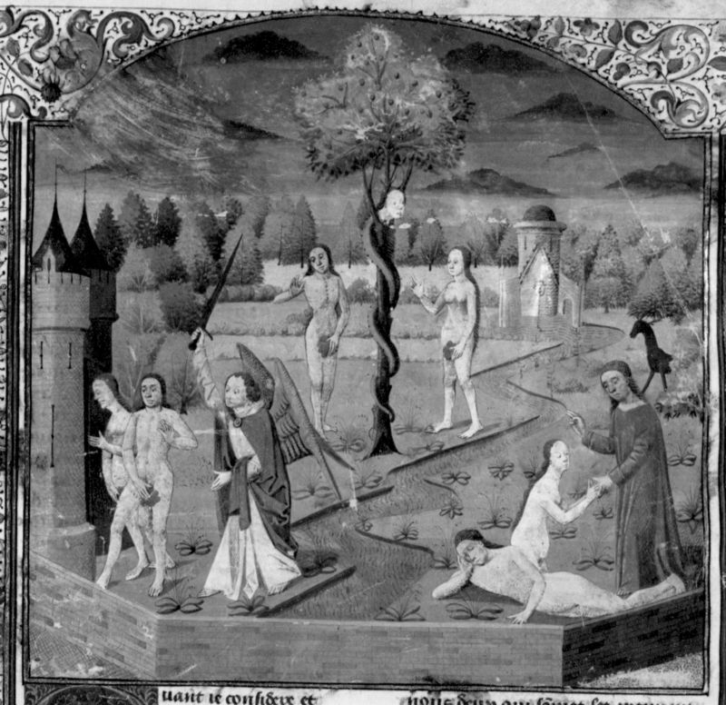 Parigi, Bibliothèque Nationale de France, Fr. 233, f. 3r. Dio crea Eva dalla costola di Adamo addormentato; Adamo ed Eva vengono tentati dal serpente a cogliere il frutto proibito dall'albero; Adamo ed Eva vengono cacciati dal Paradiso Terrestre da un angelo con la spada sguainata.