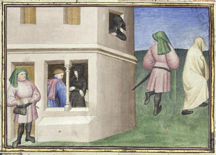 Città del Vaticano, Biblioteca Apostolica Vaticana, Pal. lat. 1989, f. 265v. Il copista del manoscritto, datato 15 giugno 1414, è Laurent de Premierfait. Monna Francesca affida un compito ciascuno a Rinuccio e Alessandro; dalla propria finestra la donna osserva Rinuccio e Alessandro, quest'ultimo vestito in un sudario da morto, fuggire dalle guardie.