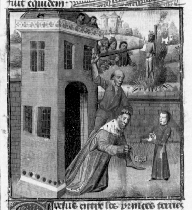 Parigi, Bibliothèque Nationale de France, Fr. 233, f. 58v. Il figlio di Creso interviene per salvare la vita del padre, che sta per essere decapitato da un soldato persiano; Creso viene legato ad un palo e arso vivo.