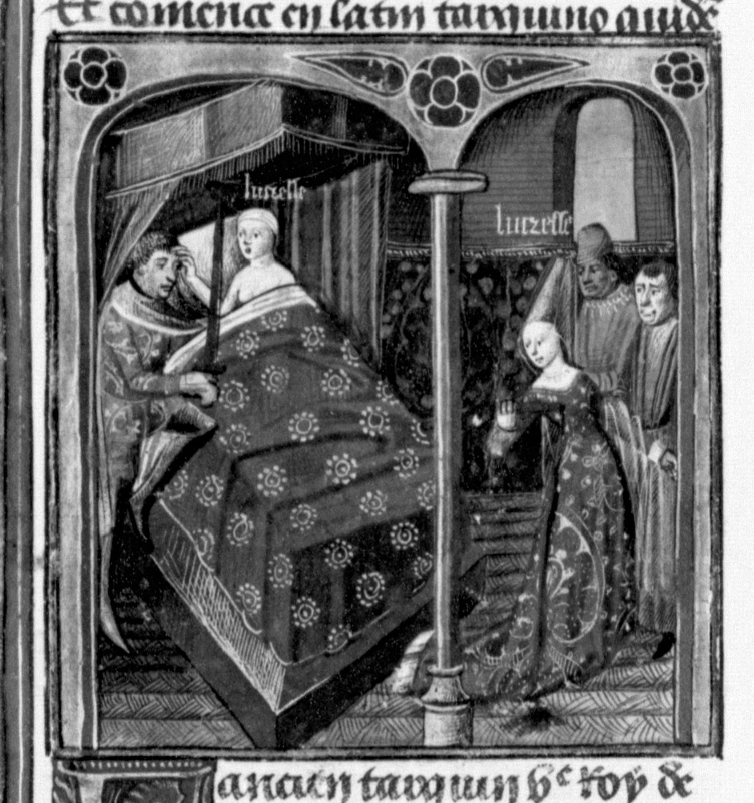 Parigi, Bibliothèque Nationale de France, Fr. 233, f. 69v. Tarquinio il Superbo aggredisce Lucrezia nel suo letto; Lucrezia compie il suicidio dinanzi ai suoi familiari.