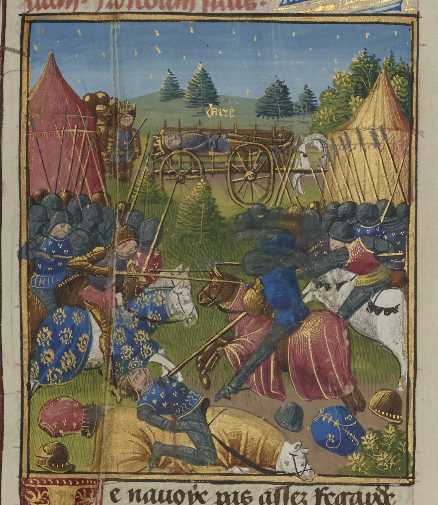 Parigi, Bibliothèque Nationale de France, Fr. 234, f. 12r. L'esercito macedone guidato da Alessandro sconfigge l'esercito persiano; Dario, re di Persia, viene colpito a morte da un dardo mentre si trova prigioniero in ceppi su un carro.