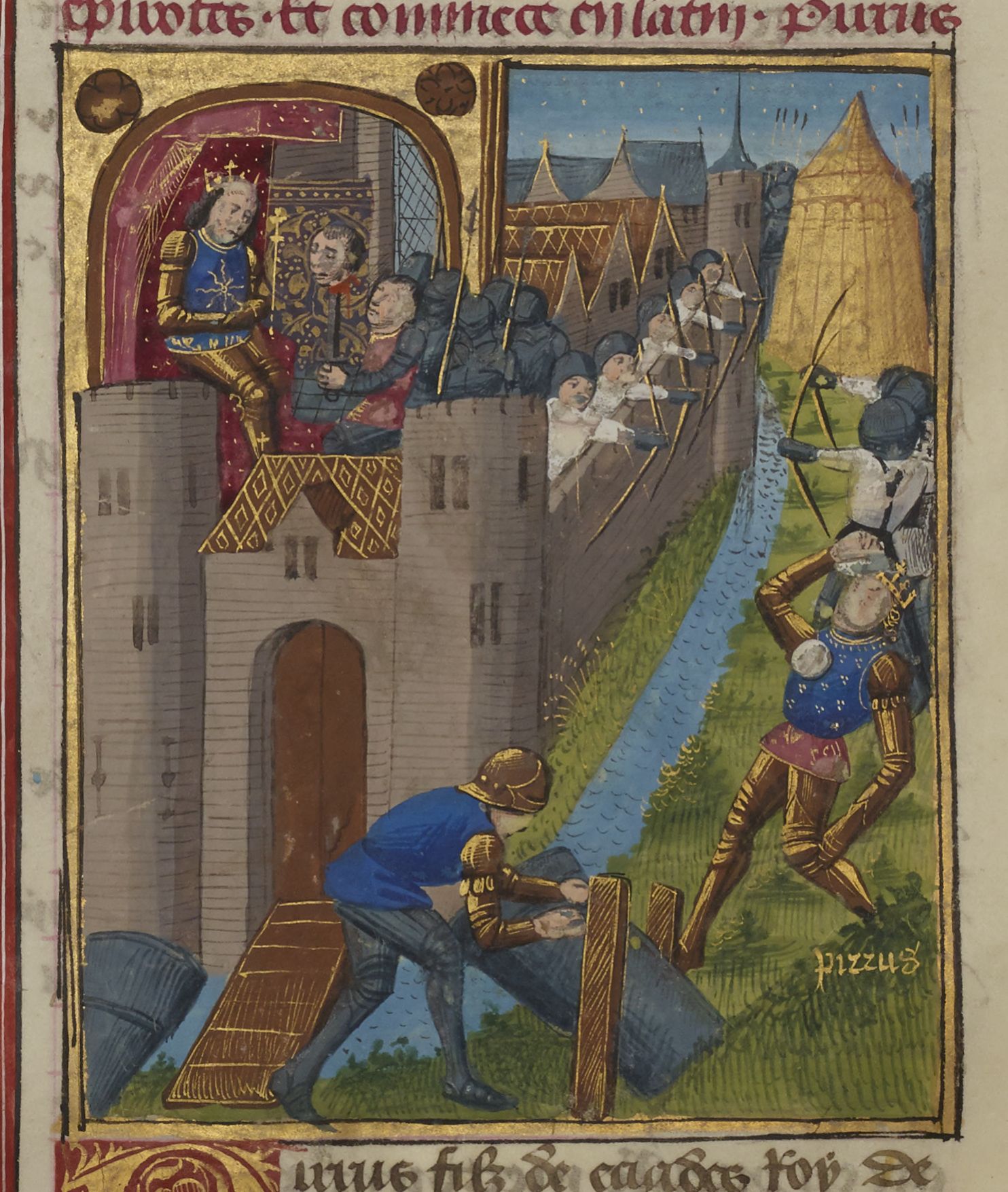 Parigi, Bibliothèque Nationale de France, Fr. 234, f. 31r. Durante l'assedio di Argo, Pirro viene colpito a morte da un masso lanciato da una catapulta; un soldato presenta la testa di Pirro ad Antigono re di Macedonia.