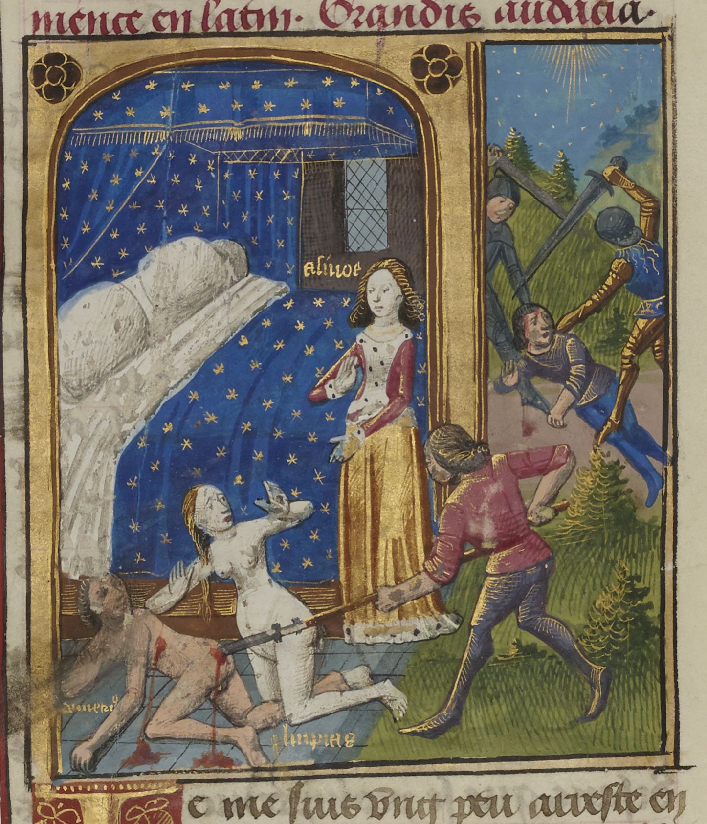 Parigi, Bibliothèque Nationale de France, Fr. 234, f. 32v. Beronice ordina l'uccisione di Demetrio, mentre Arsinoe tenta di fermare il sicario; all'esterno Aristotimo viene assassinato dai soldati.