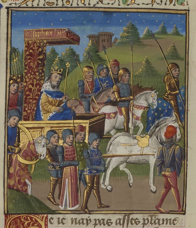 Parigi, Bibliothèque Nationale de France, Fr. 234, f. 45v. Re Siface di Numidia viene esposto su un carro durante il trionfo di Scipione l'Africano.