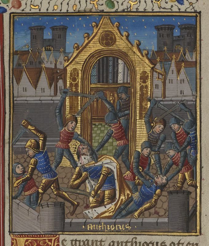 Parigi, Bibliothèque Nationale de France, Fr. 234, f. 50r. Antioco il Grande viene massacrato insieme ai suoi uomini all'esterno di una chiesa.