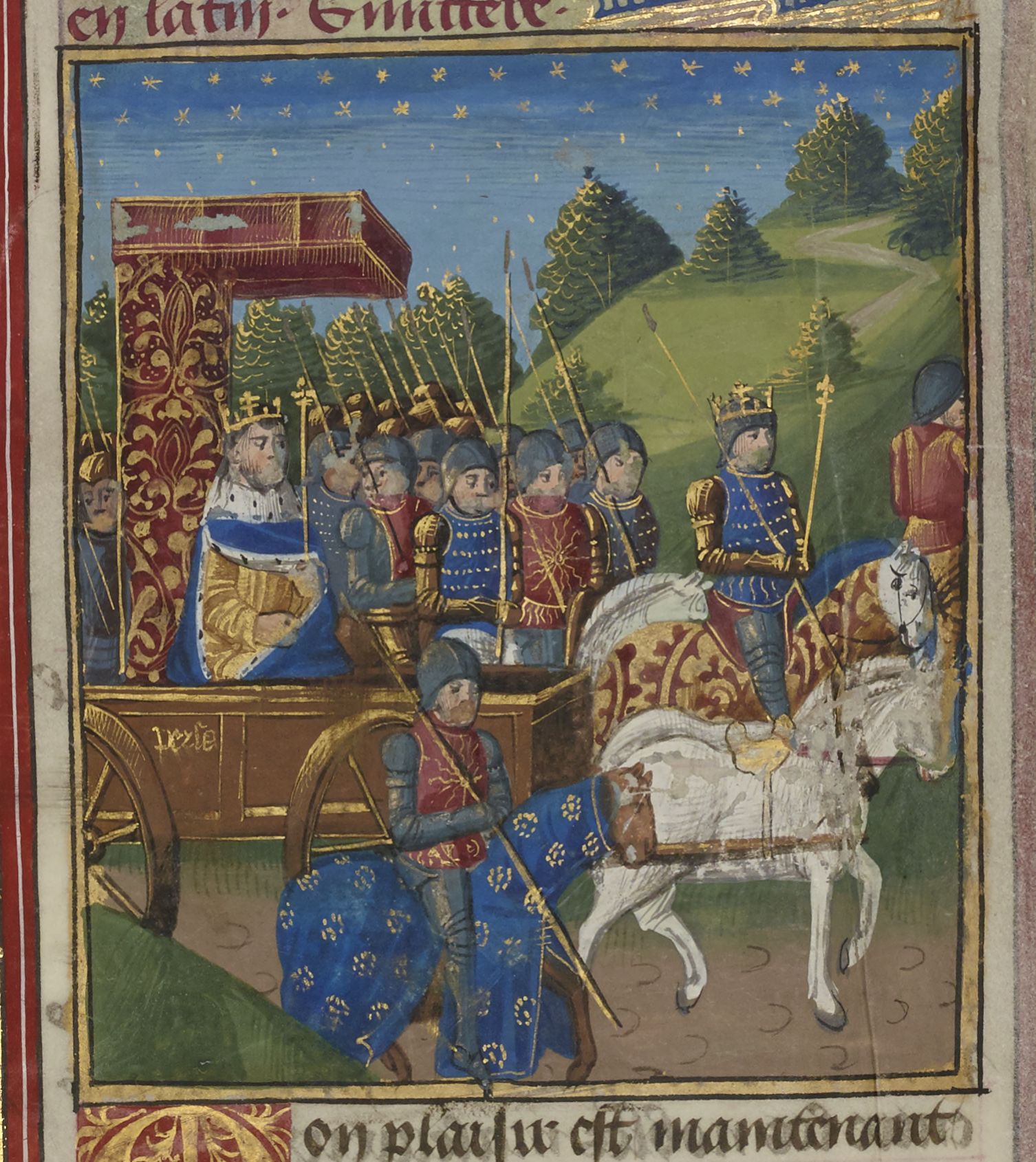 Parigi, Bibliothèque Nationale de France, Fr. 234, f. 56v. Lucio Emilio Paolo durante il suo trionfo esibisce il re Perseo ed i suoi figli prigionieri.