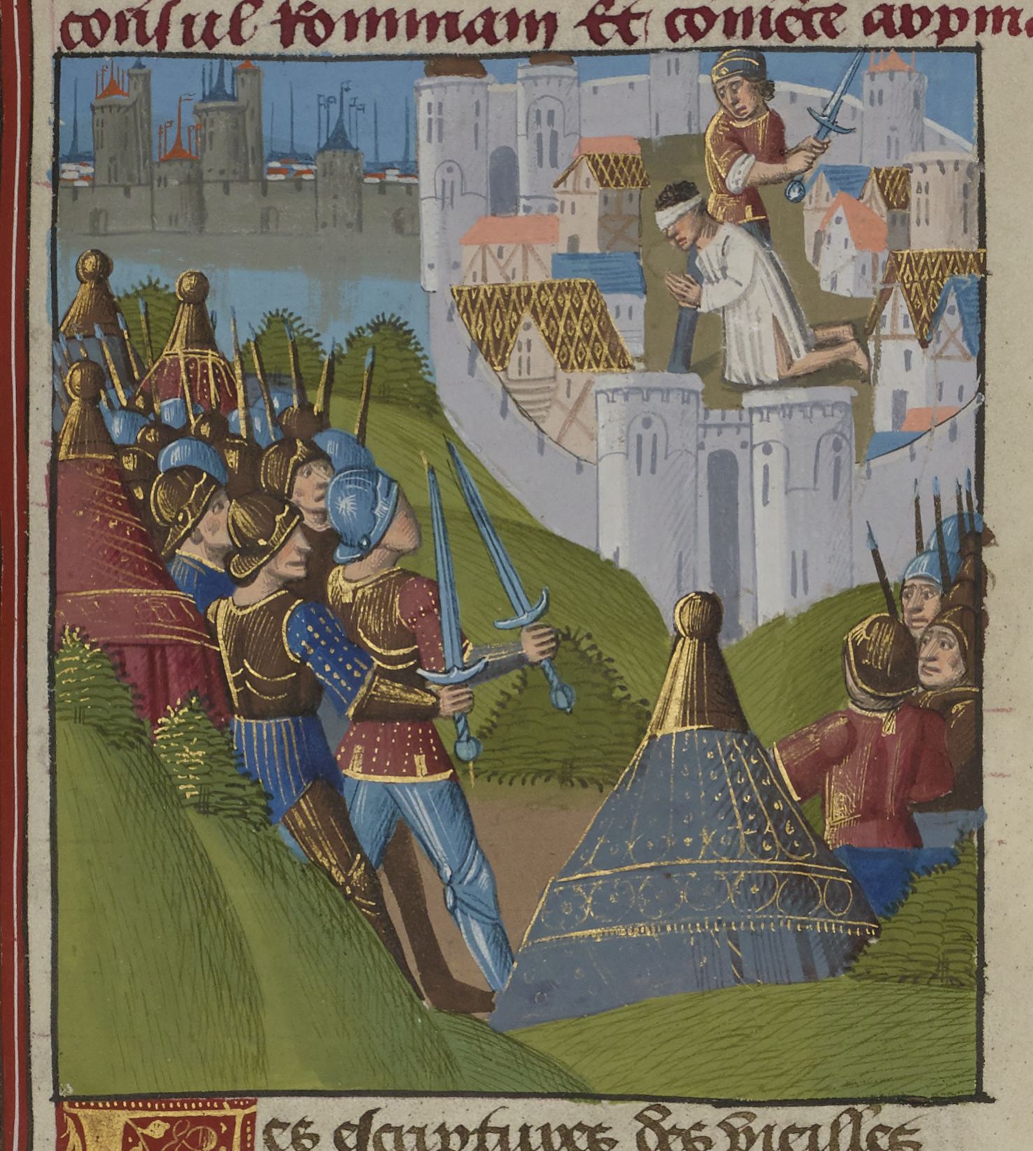Parigi, Bibliothèque Nationale de France, Fr. 234, f. 74r. Gaio Mario si fa uccidere dal suo schiavo; un esercito è accampato fuori le mura della città.