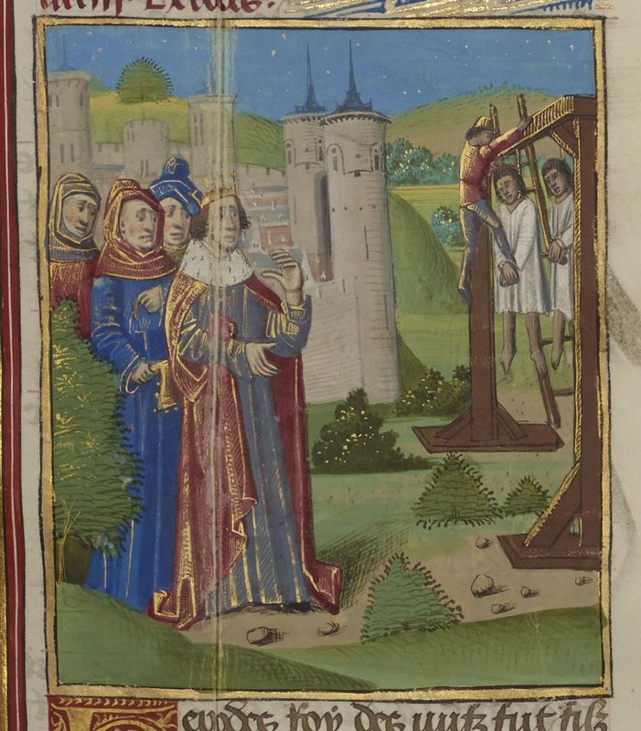 Parigi, Bibliothèque Nationale de France, Fr. 234, f. 109r. Erode ordina l'impiccagione dei suoi figli Aristobolo e Alessandro.