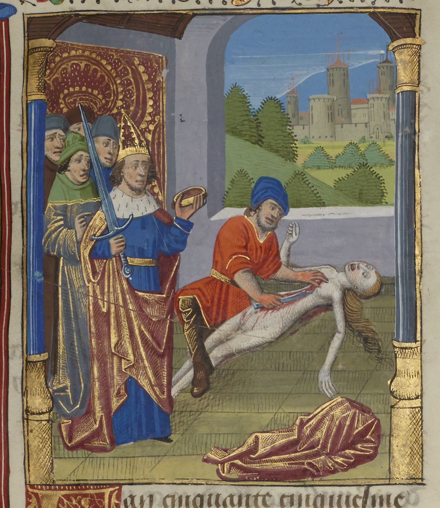 Parigi, Bibliothèque Nationale de France, Fr. 234, f. 119r. Nerone fa squartare la madre Agrippina e ne beve il sangue da una coppa.