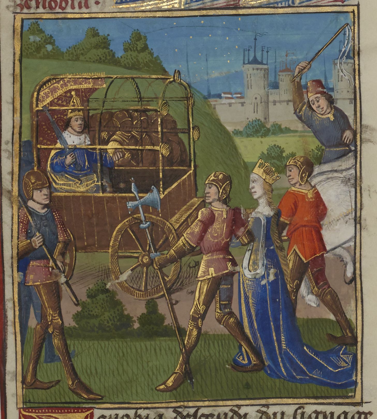 Parigi, Bibliothèque Nationale de France, Fr. 234, f. 144v. Zenobia viene portata prigioniera dinanzi all'imperatore durante il trionfo.