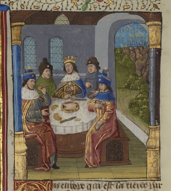 Miniatore francese (1450-1475), Re Artù siede alla Tavola Rotonda con i suoi cavalieri