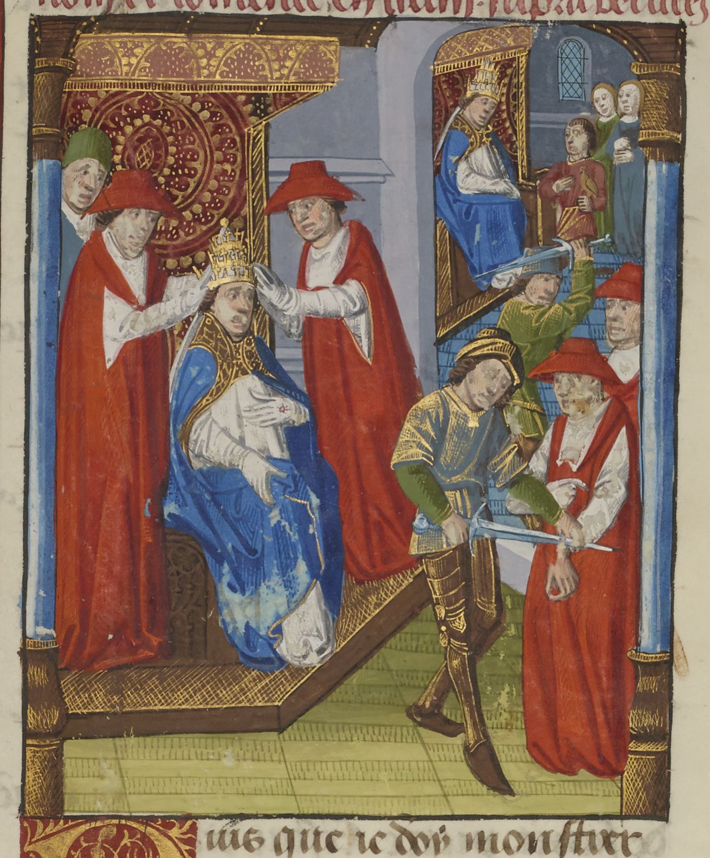Parigi, Bibliothèque Nationale de France, Fr. 234, f. 183r. Giovanni XII viene eletto papa; Giovanni XII, accompagnato da un falconiere e due dame, assiste alla punizione di due cardinali dissidenti, cui vengono amputati il naso e una mano.