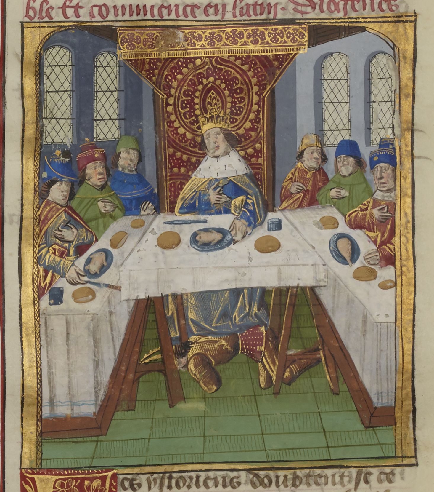 Parigi, Bibliothèque Nationale de France, Fr. 234, f. 185r. Belzet utilizza Diogene come poggiapiedi durante un banchetto.